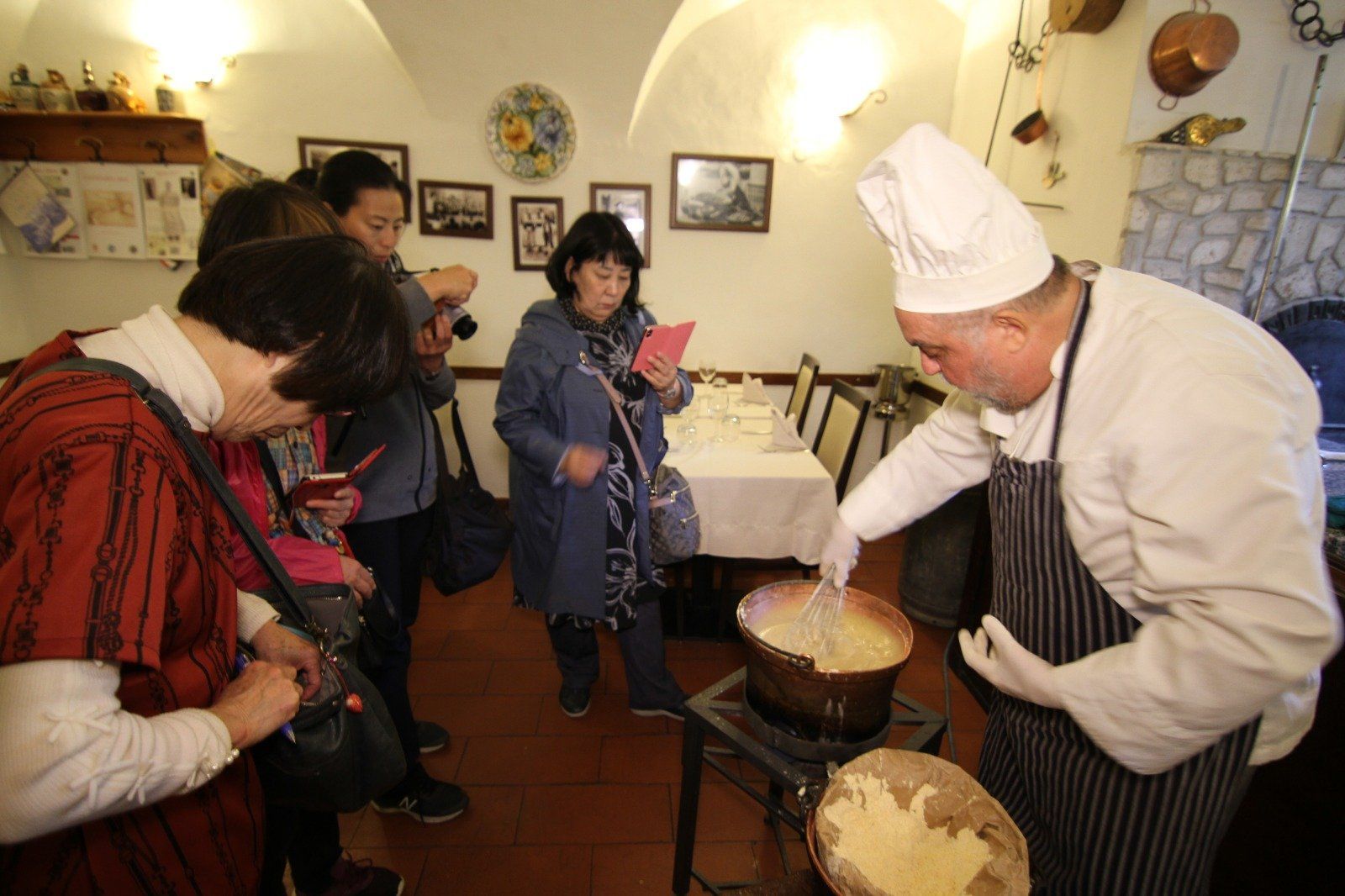 Sie lernen die Zubereitung dieses Polenta-Gerichts und entdecken, wie Sie traditionelle Kupfertopf-Methoden in moderne Küchen umsetzen und gleichzeitig eine Reihe authentischer und gesunder lokaler Gerichte kreieren, die sowohl Fleischessern als auch Vegetariern schmecken. Auch Food-Fotografen haben hier zahlreiche Möglichkeiten. Sie werden bereits verstanden haben, dass unsere Küche typisch regional ist. Wir befinden uns inmitten eines vornehmen Innenhofs im Herzen des Dorfes. Im Restaurant befindet sich noch eine alte Hebelpresse aus dem 17. Jahrhundert. Polenta di Pettorano ist in den Abruzzen einzigartig, dank des verwendeten Maismehls und der handwerklichen Verarbeitung, wie sie einst praktiziert wurde. Eineinhalb Stunden lang im Kupfertopf mit Holzstab verrührt, wird die feste, nicht flüssige Konsistenz in hauchdünne Scheiben geschnitten und mit einer köstlichen weißen Sauce namens „Rognoso“ auf Basis von Pecorino und gebratenem Speck serviert. Willkommensaperitif, Kochkurs, komplettes Mittagessen mit frisch zubereiteter Polenta, Königin der Tafel.